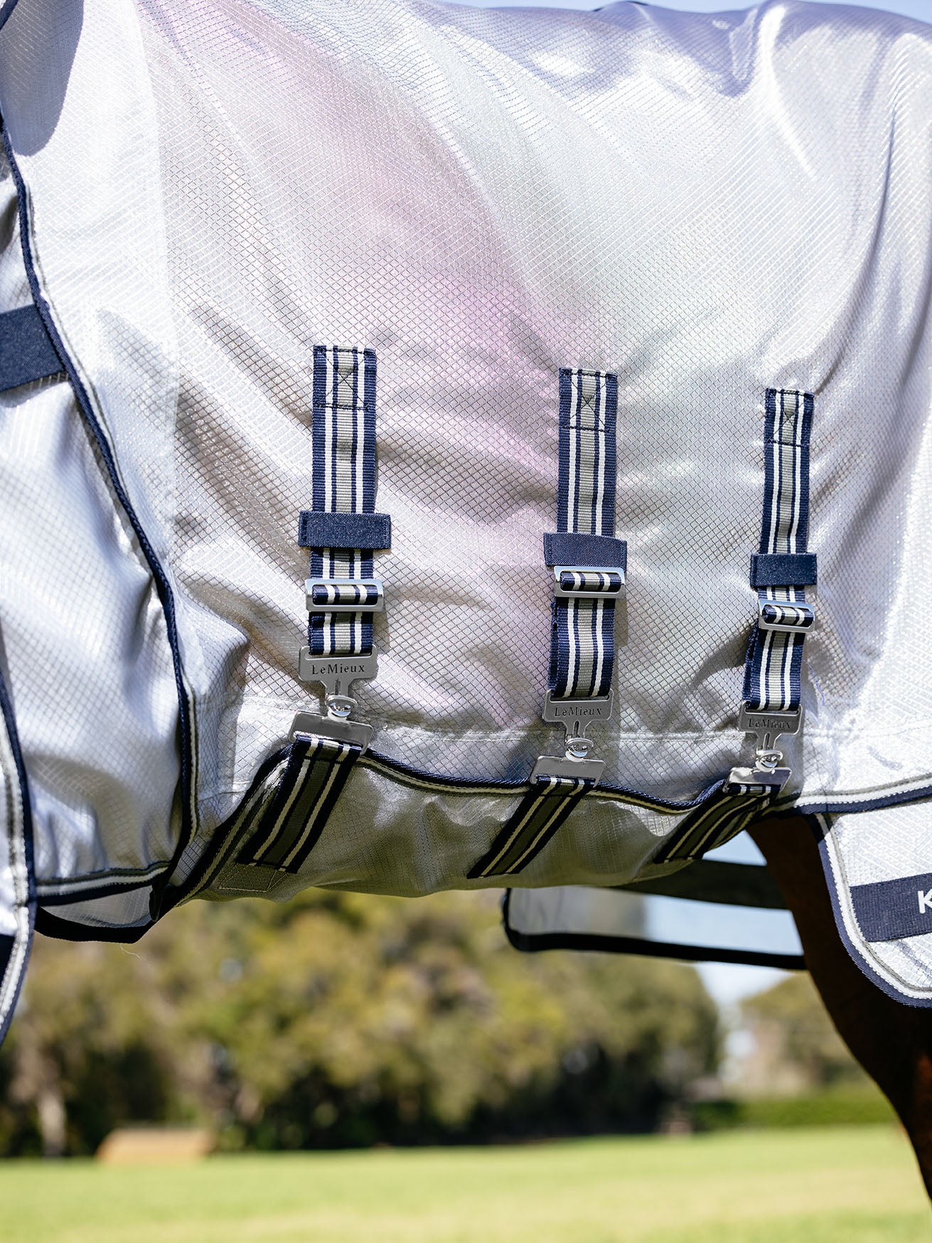 The LeMieux® Kudos AeroGuard Fly Sheet is 100% nylon mesh with silver anti-bacterial coating that provides a barrier against insects and midges as well as stands up to snagging. Fabric stands slightly away from the horses body around the spine and hips, promoting air flow and breathability. Shoulder gussets allow for maximum freedom of movement over the shoulder and 'Wrap under' stomach covering protects the belly. Adjustable stainless steel double trigger clip on the front chest allows for extra adjustability over the shoulders. Antibacterial and anti-static shoulder lining.