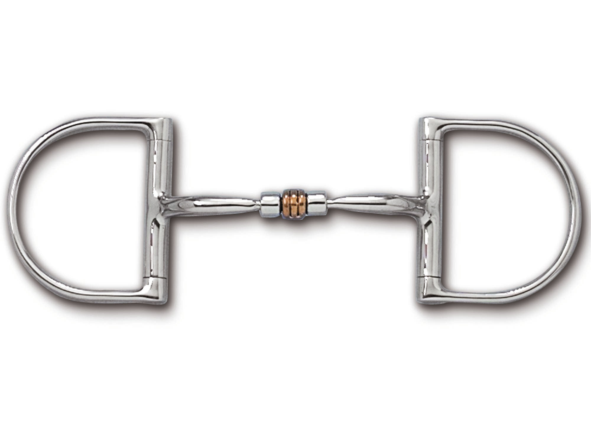 The Myler® English D-Ring with MB 03 mouthpiece is a Level 1 bit intended for horses that are beginning training. The free-rotating barrel uses mostly tongue pressure and collapses onto the bars. The curved mouthpiece permits the horse to swallow more freely and distributes pressure evenly. Independent Side Movement™ allows the rider to isolate one side of the bit for bending, balancing or lifting a shoulder. Stainless steel with copper inlay and copper roller.