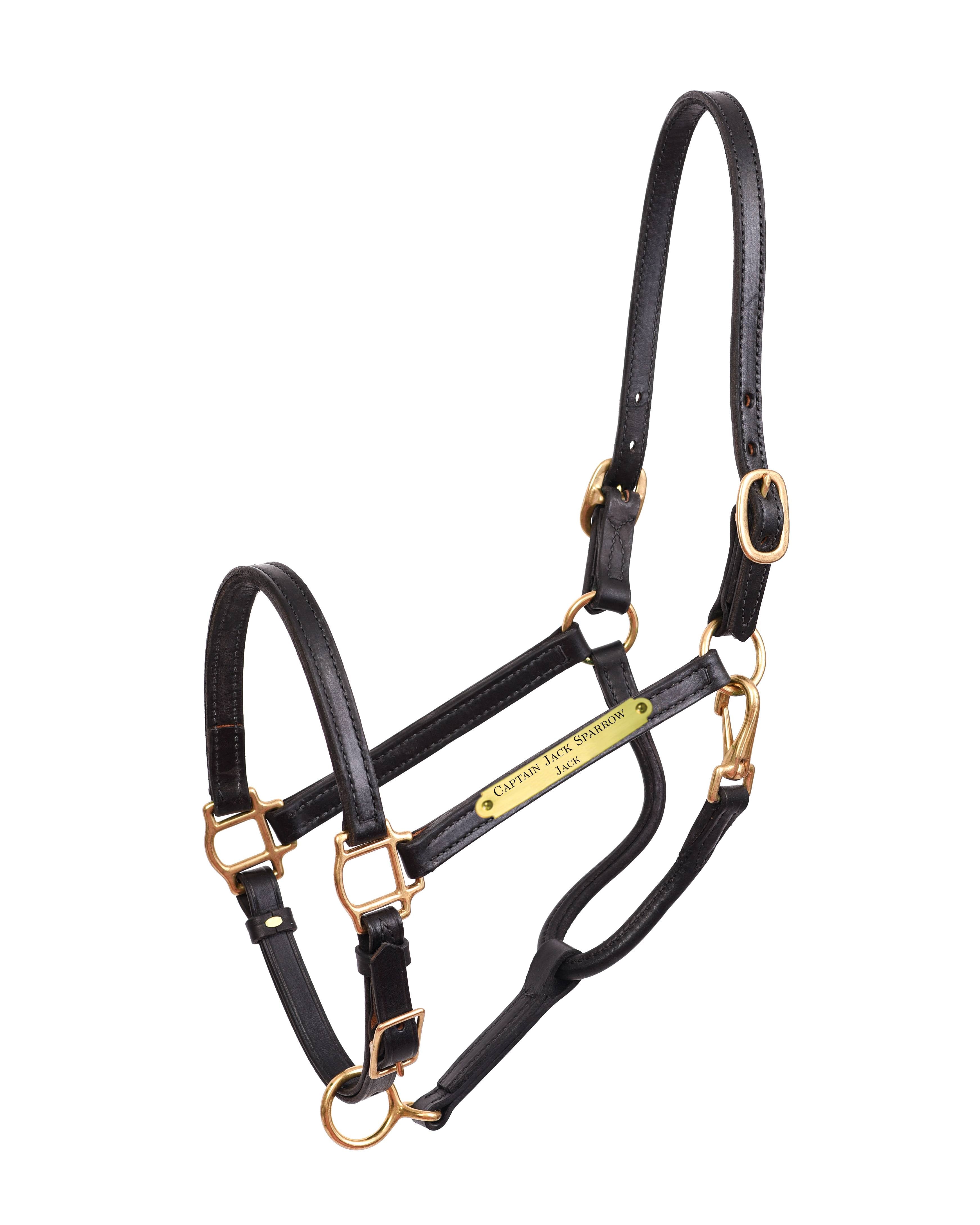 Perri’s® 3/4" Premium Leather Show Halter with Nameplate features a narrower width that flatters horses with refined heads. This double-stitched leather halter has a double-buckle crown, rolled throat with snap, an adjustable chin and solid brass hardware. The 1/2"W x 3"L lacquer-coated nameplate can hold up to 20 characters.