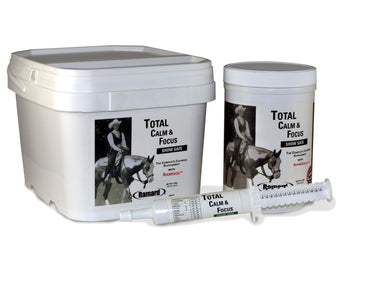 Ramard™ Total Calm & Focus is an all-natural supplement developed to calm nervous, anxious horses while enhancing focus. It contains Ramisol to help prevent the increase of cortisol, a stress hormone released in response to high intensity. Magnesium and a balanced blend of B vitamins are also added, which have been shown to be effective in nervous, hyper horses. Mint-flavored paste in an oral syringe.