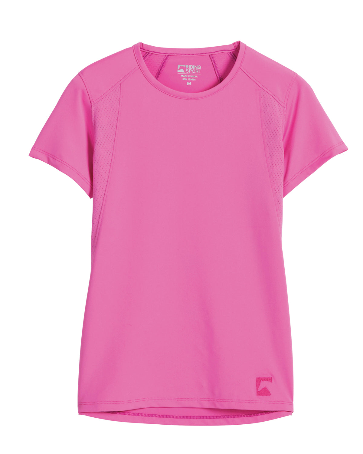 The Riding Sport™ Kids’ Trisha Short Sleeve Shirt is designed as the ideal hot-weather riding top. Extremely breathable and lightweight fabric partners with opaque mesh panels under the sleeves and through the back to maximize airflow. High stretch and raglan cap sleeve construction help to optimize a rider’s mobility. Active moisture wicking means this athletically styled shirt works to keep skin dry.