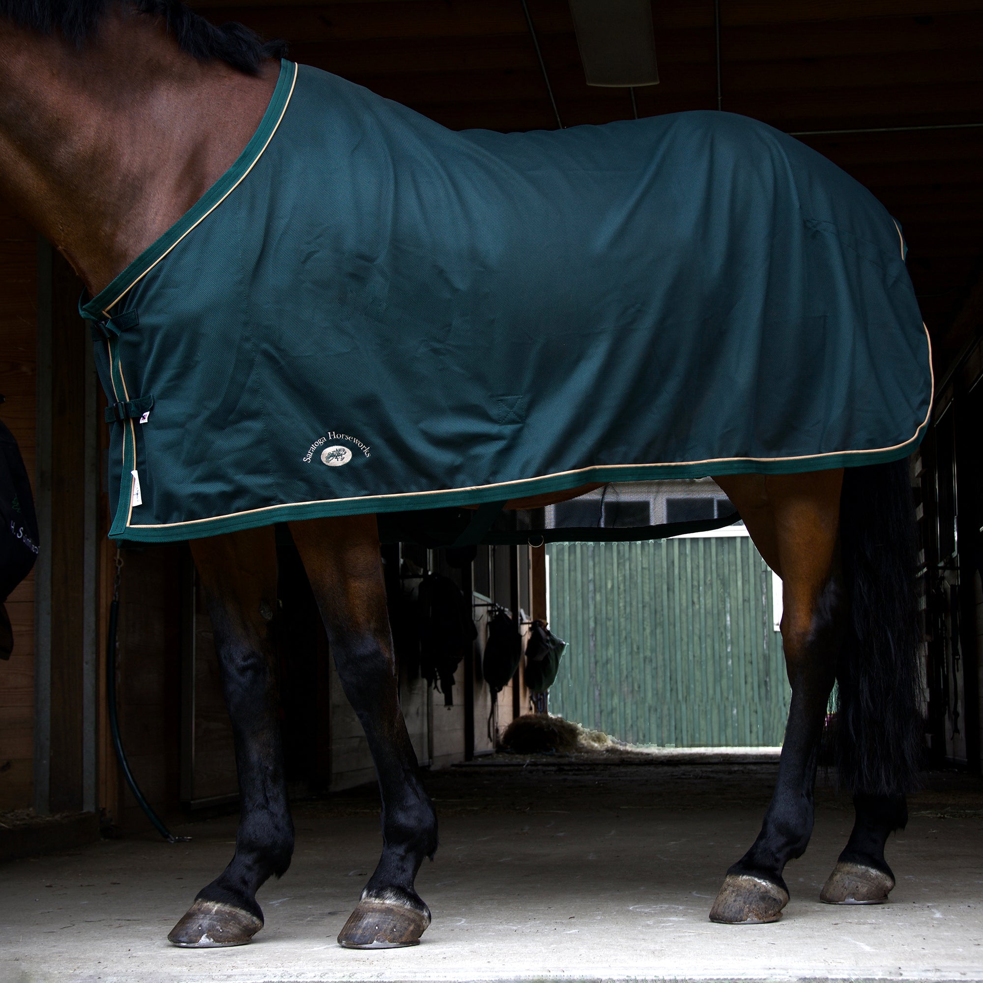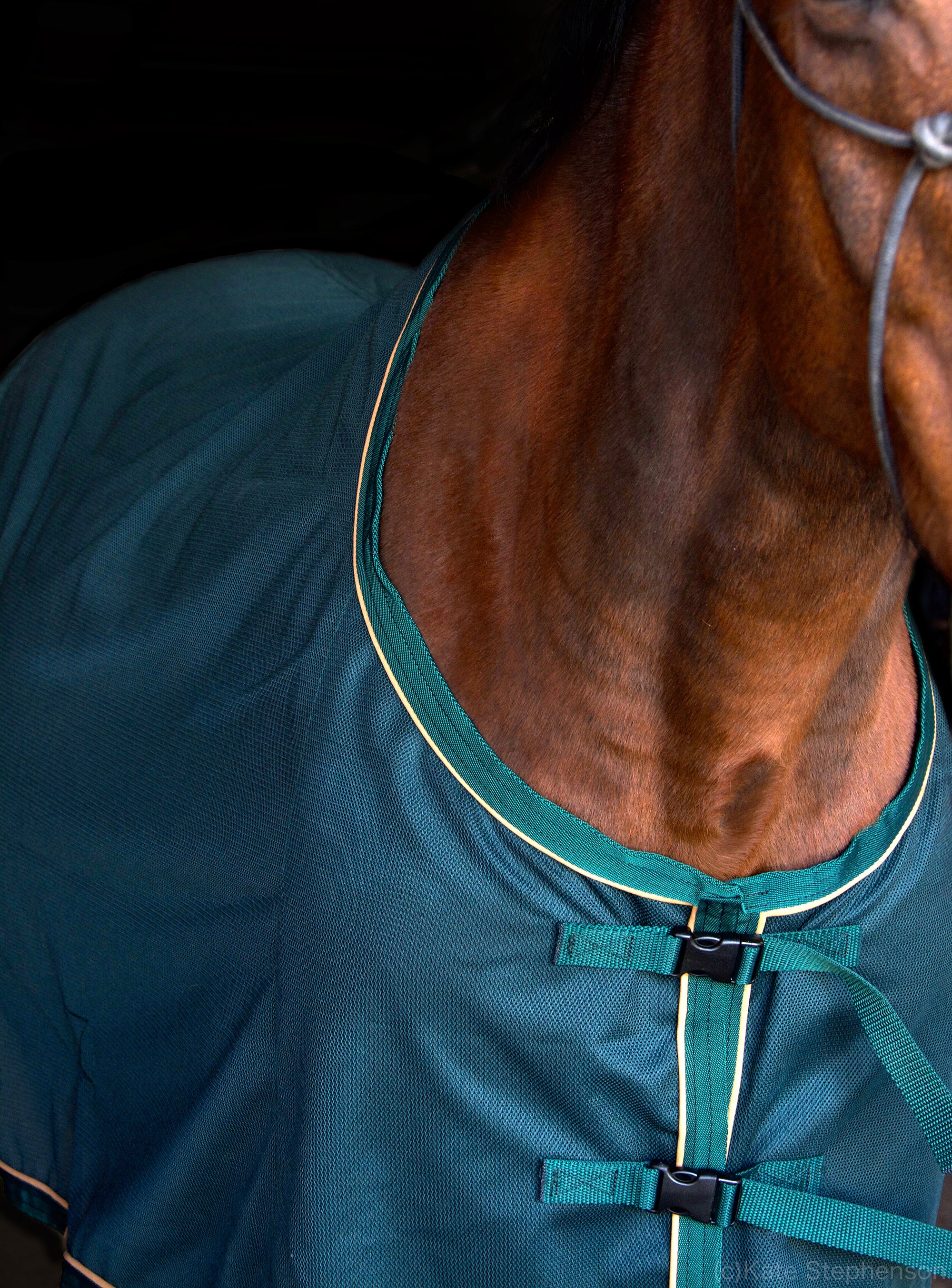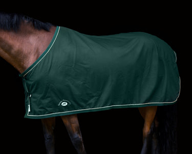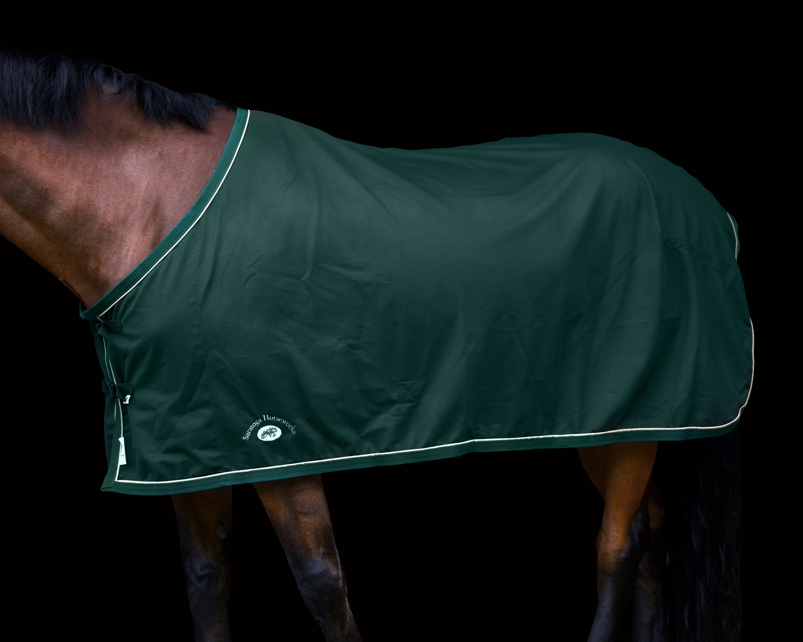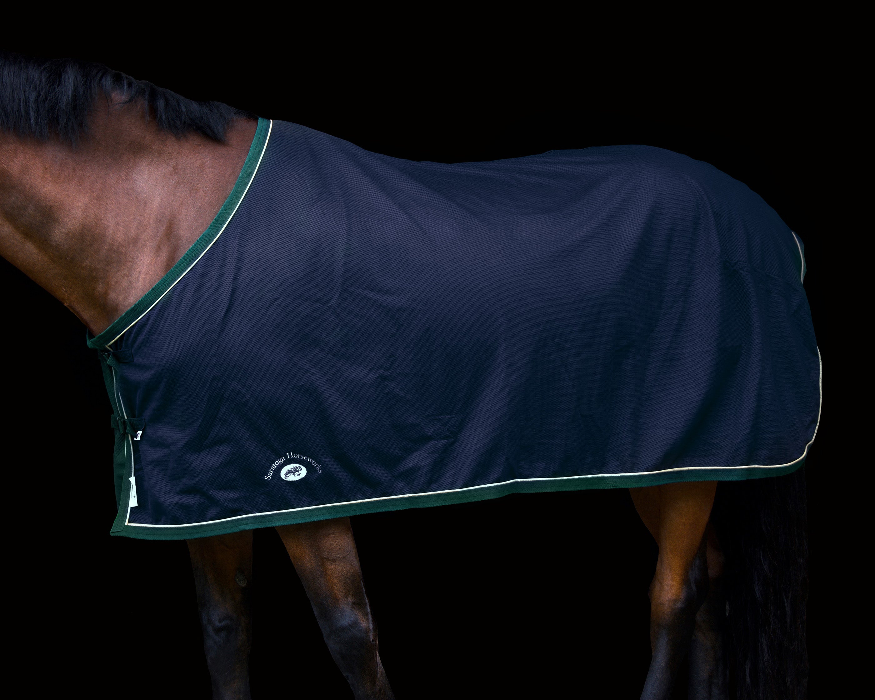 Ringside fashion for the warmer months! The Saratoga Oasis Summer Dress Sheet is made from Oasis lightweight mesh fabric. It breathes to keep your horse comfortable while it protects his coat from dust, flies and fading from the sun by blocking 10% more of its harmful radiation than the typical scrim. Treated with 3M® Scotchgard® for stain resistance, this summer sheet is cut for a superior fit. It secures with two side-release chest buckles, a hidden surcingle and a tail strap. D-rings allow for the addition of leg straps (not included). Piping options are available for an additional charge. Personalize yours with a monogram. Allow 1-2 weeks for delivery. If you add a monogram, allow an additional 1-2 weeks.