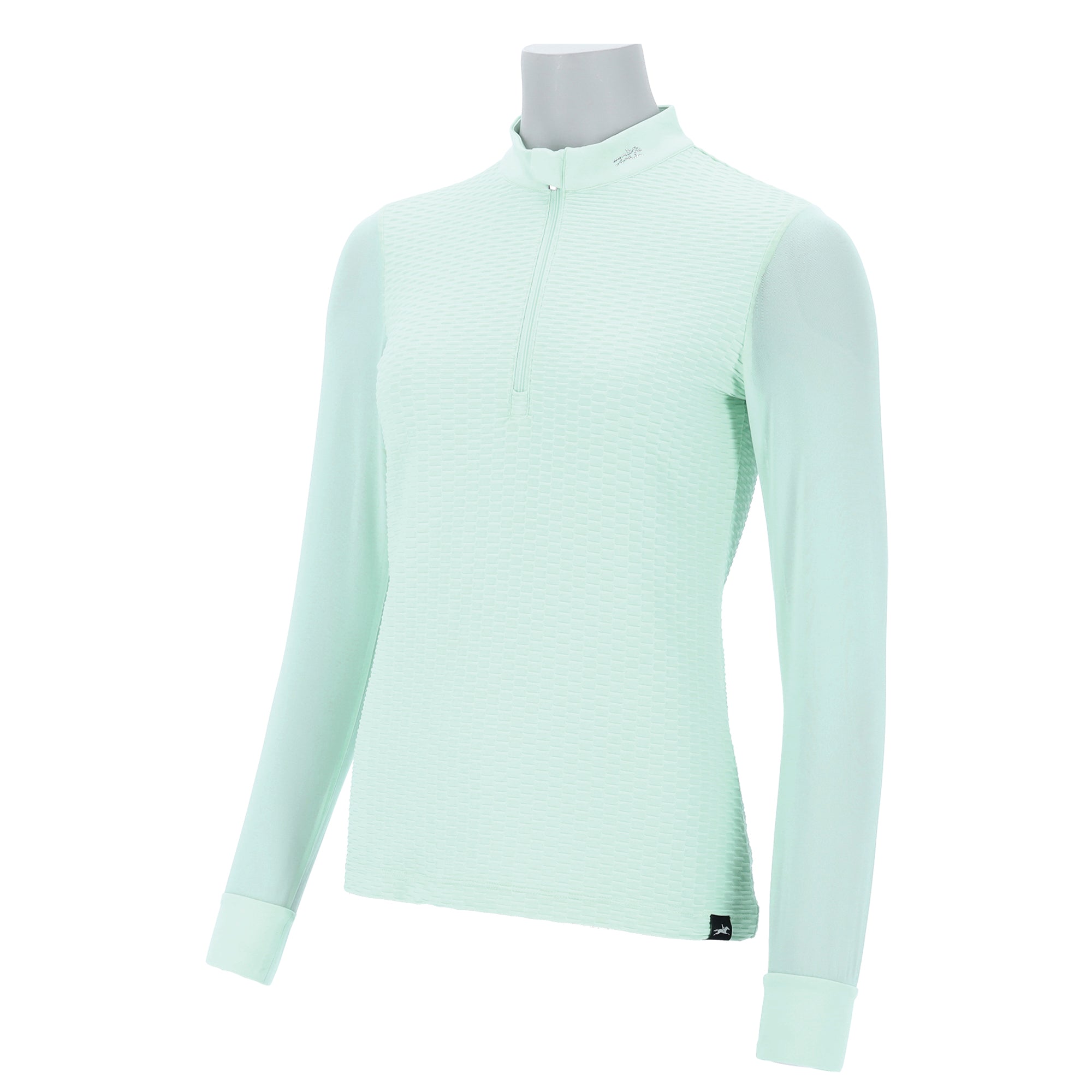 A structured shirt designed to flatter, the Schockemöhle Ladies’ SpGianna Long-Sleeve Shirt is perfect for training and competition. Long sleeve with cuff, transparent mesh sleeves keep you cool as the air flows through and front zipper adds extra cooling. Logo rhinestone horse on the stand-up collar and textured material through the body adds elegance.