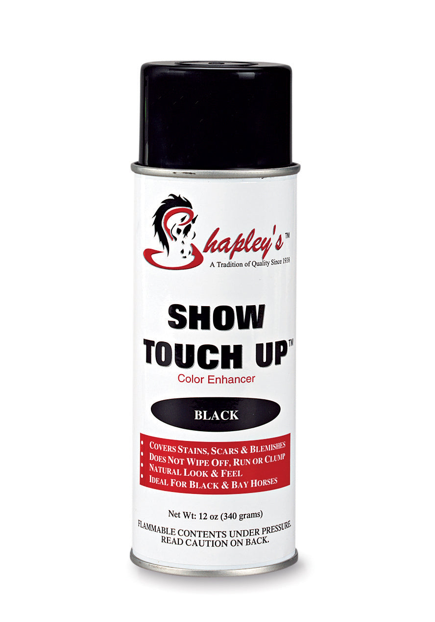 Shapley's™ Show Touch Up in colors to enhance your horse's coat covers stains, scars, blemishes and flaws. It can also be sprayed on tails to create a fuller appearance. Show Touch Up won’t smear, clump, wipe off accidentally or wash off in the rain—and it won’t damage your horse’s hair. 12 ounces.