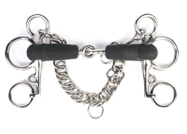 This Jointed Short Shank Rubber Pelham Bit features a rubber-covered mouthpiece. The rubber makes it thicker and softer on the horse's mouth. The shorter shank is more mild than a longer shank. It can be used with two reins or bit converters.