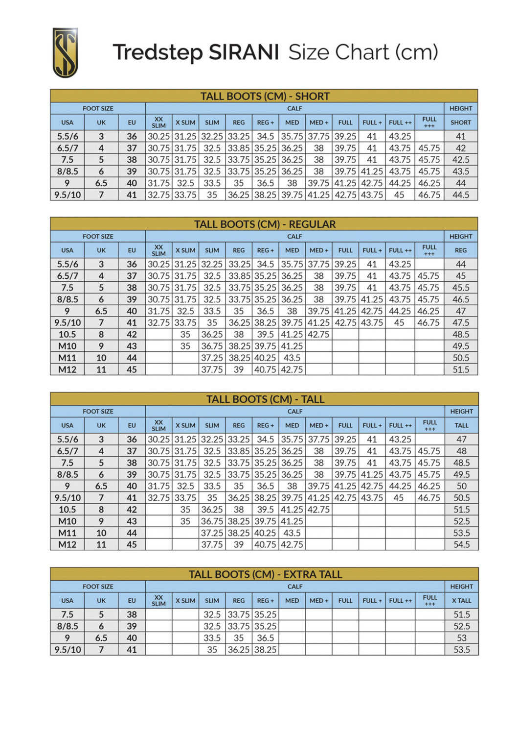 | FOOT SIZE | CALF | USA | XX SLIM | X SLIM | SLIM | REG | REG+ |